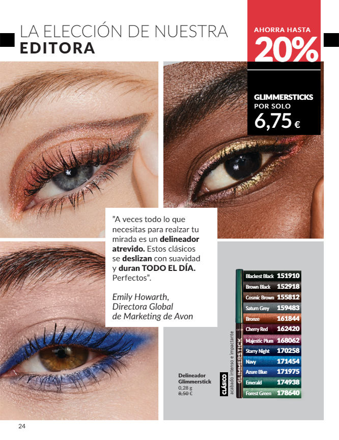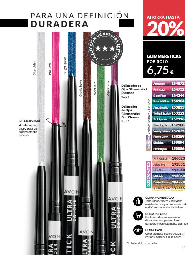Delineador de Ojos Glimmerstick Diamonds Avon True Colour - Dibuja líneas de color duradero y fáciles de difuminar en tus ojos, con un acabado brillante y espectacular, que dura hasta 12 horas. Este delineador, con punta automática, proporciona a tus ojos una definición de alto impacto gracias a su fórmula cremosa, de aplicación suave y enriquecida con vitaminas. ¡Que no falte el brillo en tus ojos! Resistente al agua. 0,28 g.