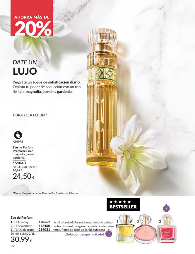 Fragancias Avon Premiere Luxe Eau de Parfum - Una combinación intensa de notas lujosas de Magnolia Grandiflora, Jazmín Sambac y Gardenia para una aroma intenso y duradero. Distingue tu lado más sensual con Premiere Luxe. Intensa combinación de notas de jazmín sambac y gardenia enriquecida con flores blancas exclusivas. Perfume elegante y sensual, un regalo ideal. 50 ml.