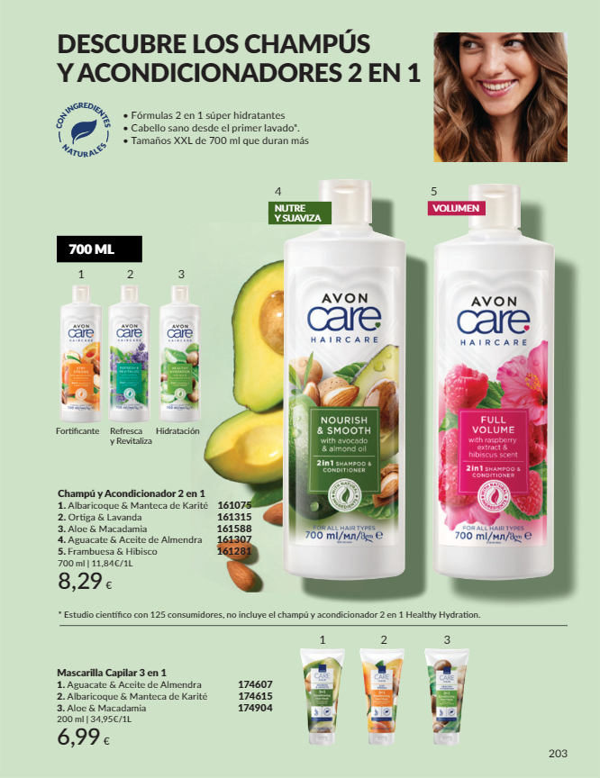 Cosméticos Avon Mascarilla Capilar Ligera Superfruit Soufflé Naturals - Crema de textura ligera y envolvente para el verano. Para utilizarlas, después de lavar el cabello, repartir uniformemente en el cabello húmedo, dejar 5 minutos y aclarar. Peinar como habitualmente. 125 ml.